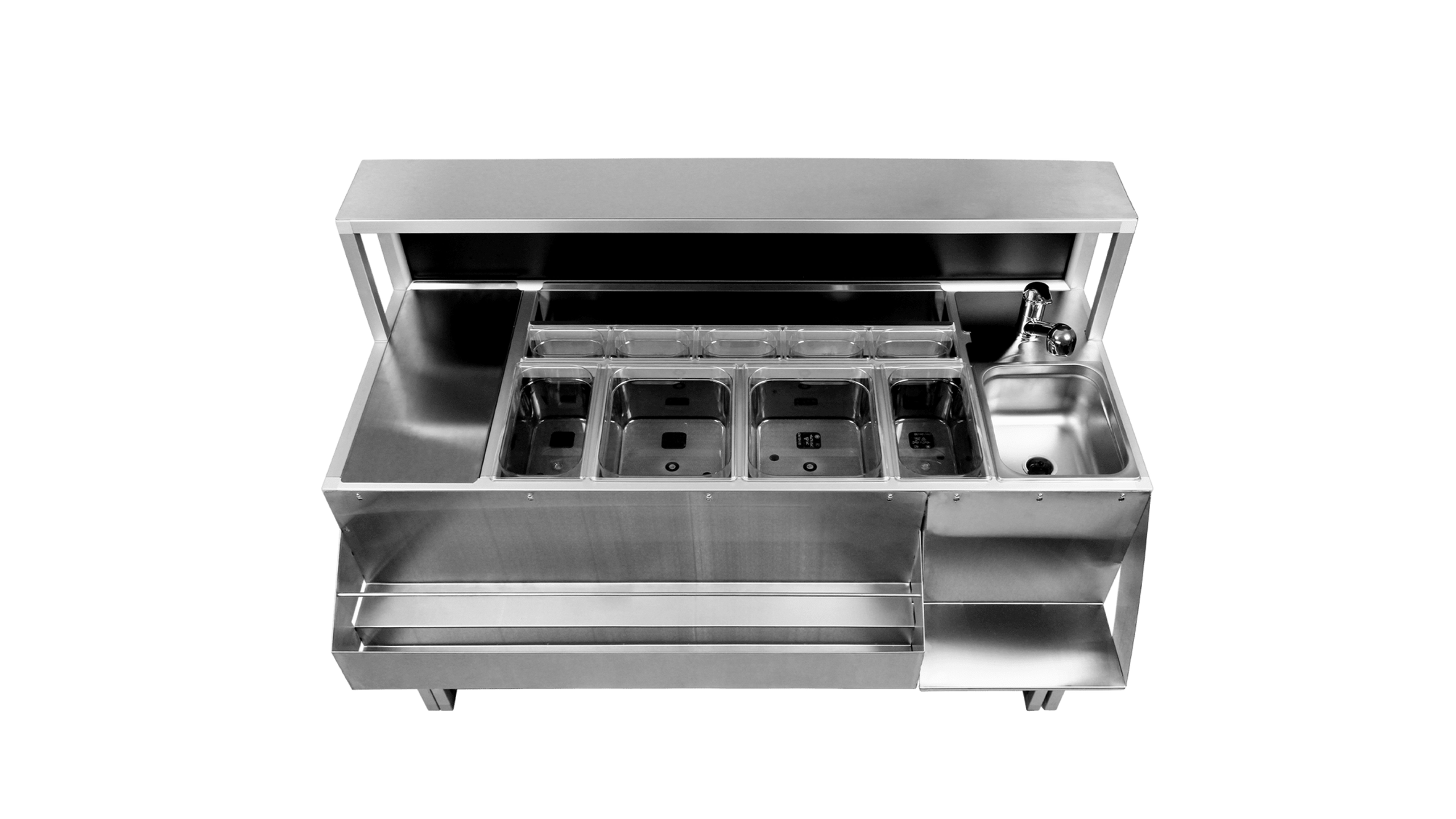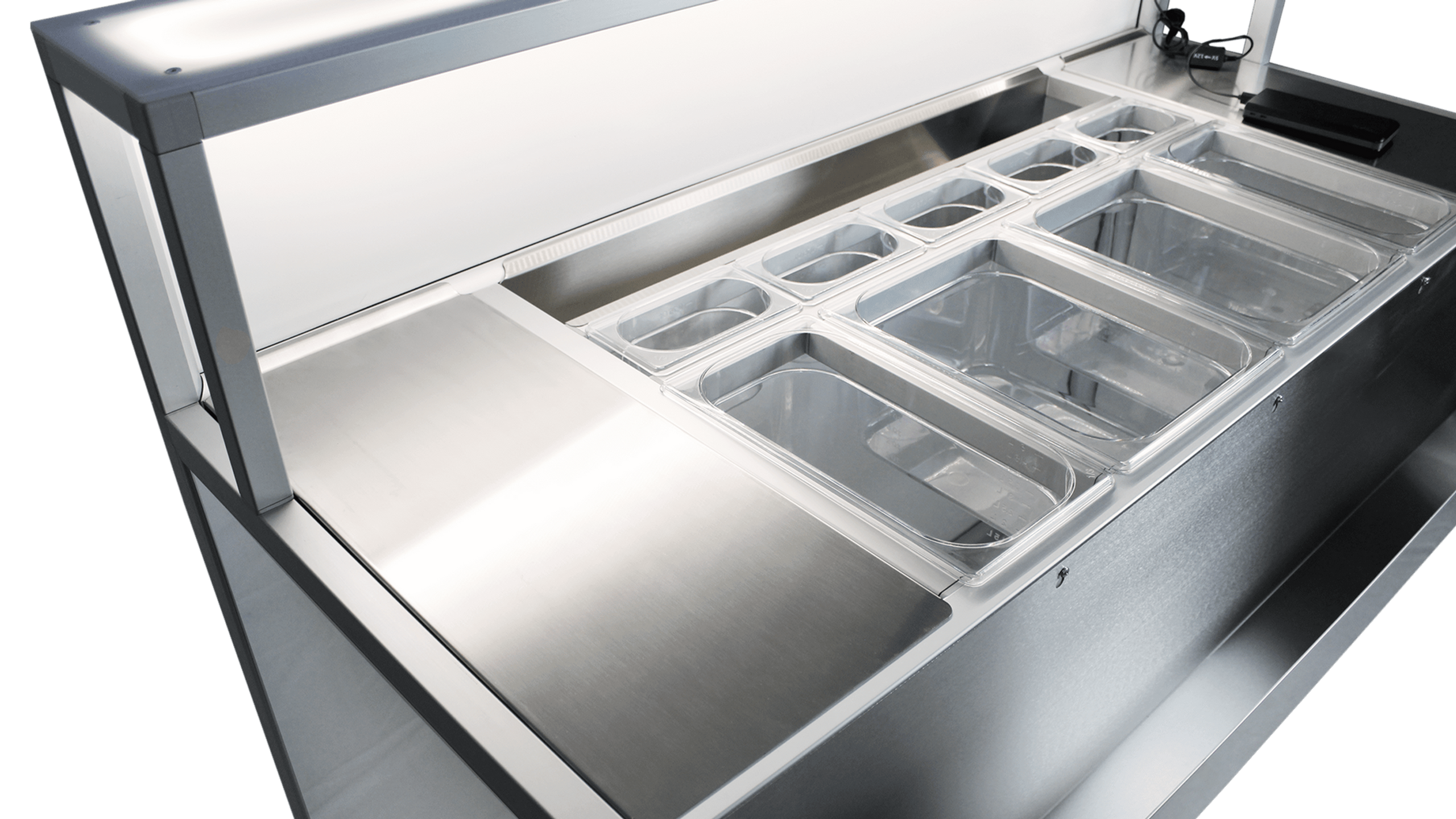 U sredini 2 velike i 2 male GN posude za led i razno.